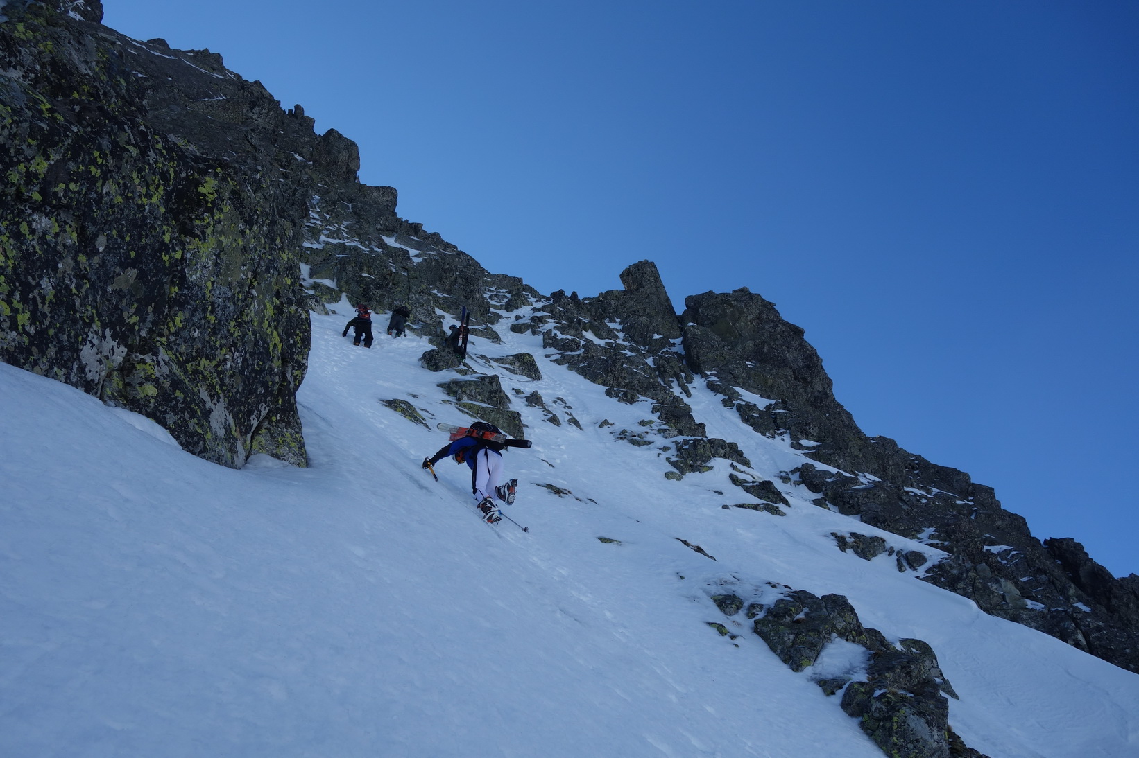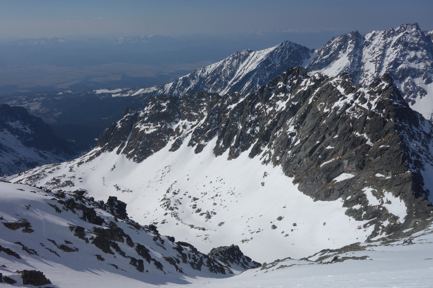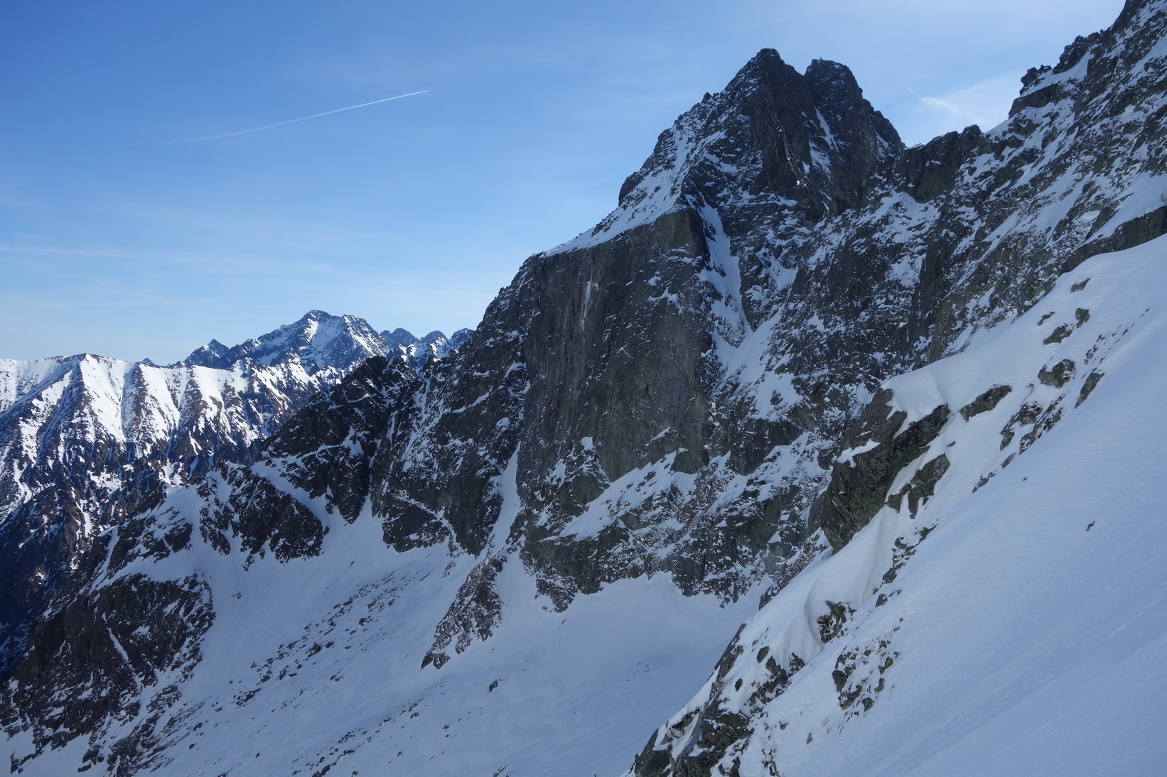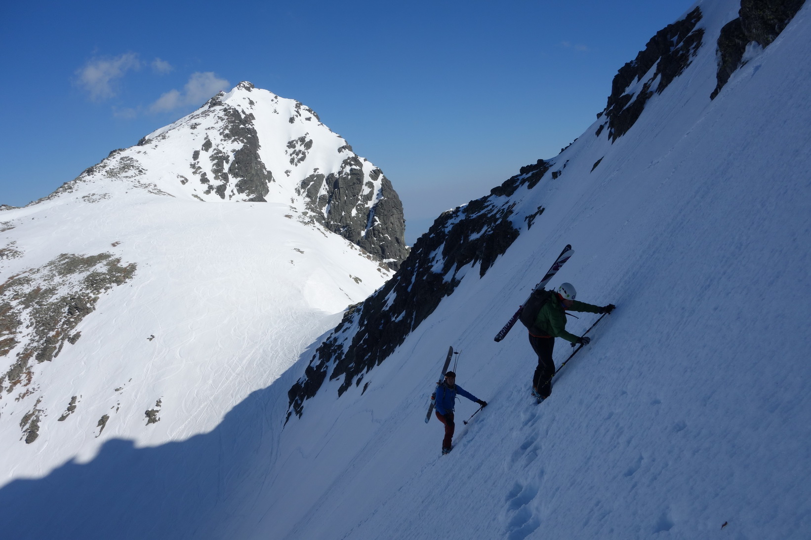 Začnem rovno zjazdom z Váhy. O 9,30 severovýchodný svah ponúka perfektné podmienky a aj po prechode do tieňa je lyžovačka stále veľmi príjemná. Pokračujeme v tomto trende až k Ťažkému plesu. Sme maximálne spokojní a vieme, že výstup na Mlynára, ktorý sa už od rána kúpe v slnečných lúčoch nebude zadarmo a lyžovačka nebude vo firne ale v kejde. Nevadí. Sme uchvátení výhľadmi na severné steny Ganku, Vysokej, Gerlachu a celkovo úplne iným pohľadom na hlavný tatranský hrebeň.