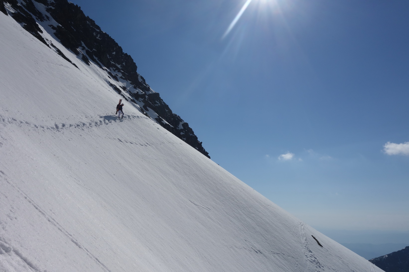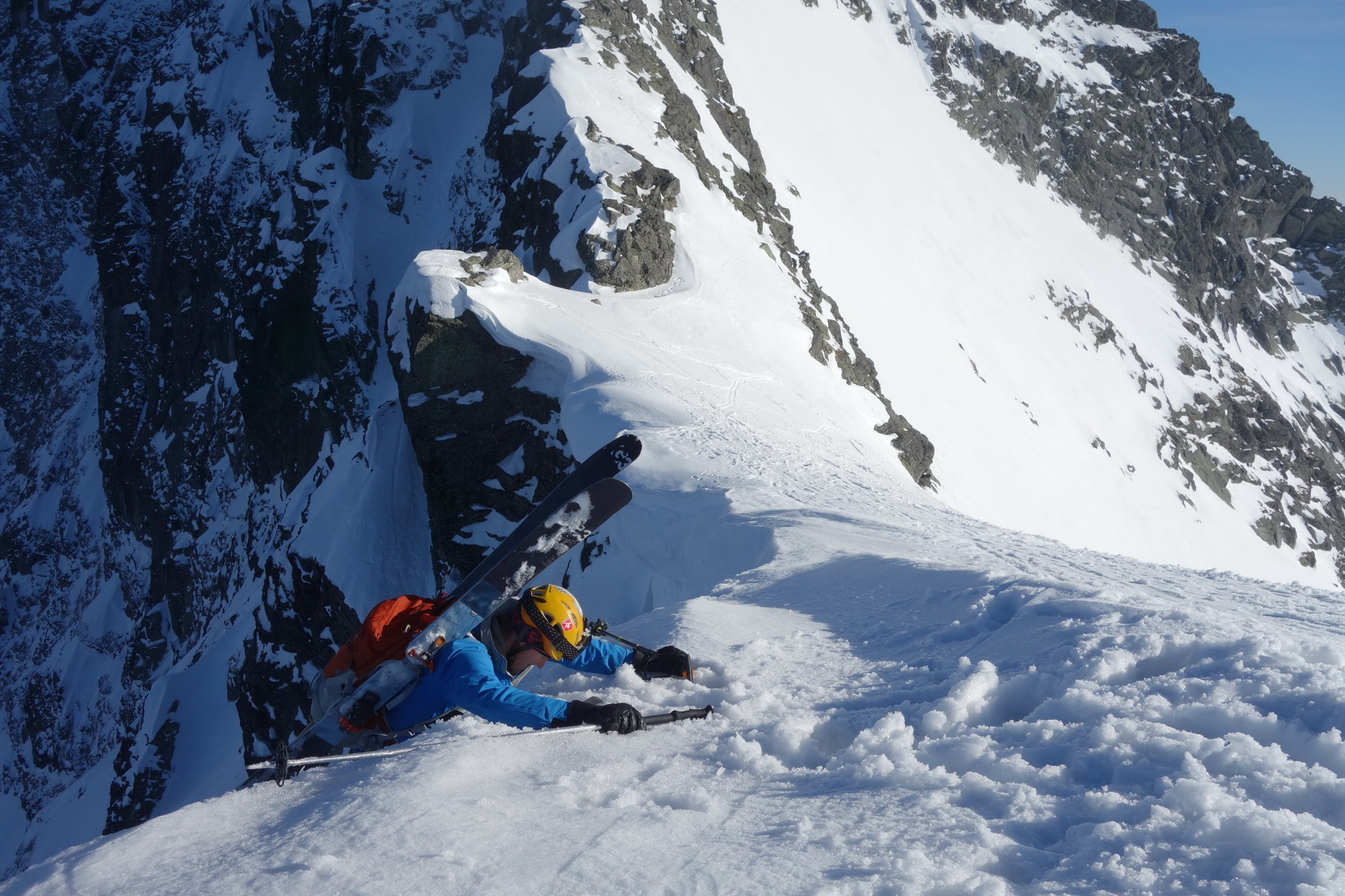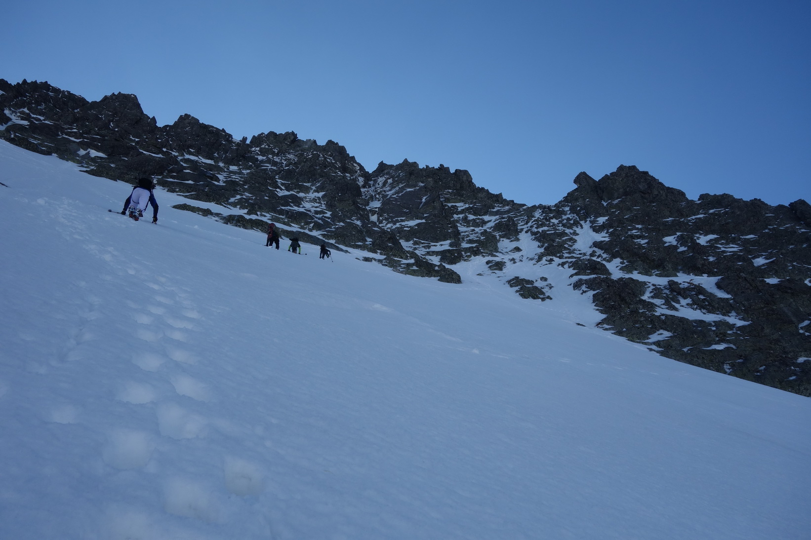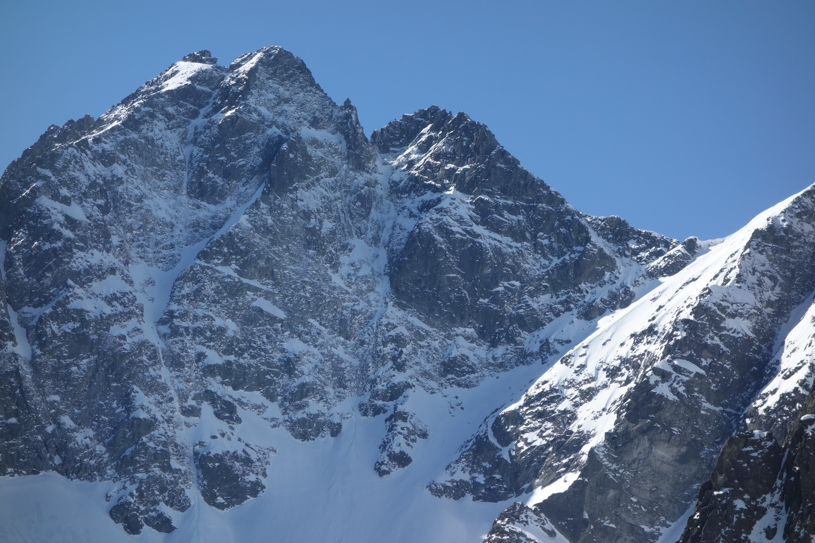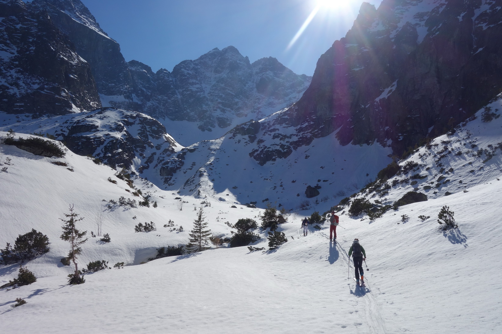 Začnem rovno zjazdom z Váhy. O 9,30 severovýchodný svah ponúka perfektné podmienky a aj po prechode do tieňa je lyžovačka stále veľmi príjemná. Pokračujeme v tomto trende až k Ťažkému plesu. Sme maximálne spokojní a vieme, že výstup na Mlynára, ktorý sa už od rána kúpe v slnečných lúčoch nebude zadarmo a lyžovačka nebude vo firne ale v kejde. Nevadí. Sme uchvátení výhľadmi na severné steny Ganku, Vysokej, Gerlachu a celkovo úplne iným pohľadom na hlavný tatranský hrebeň.
