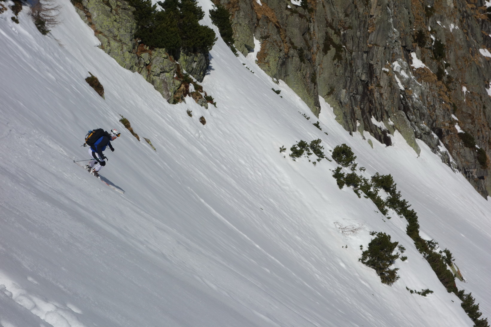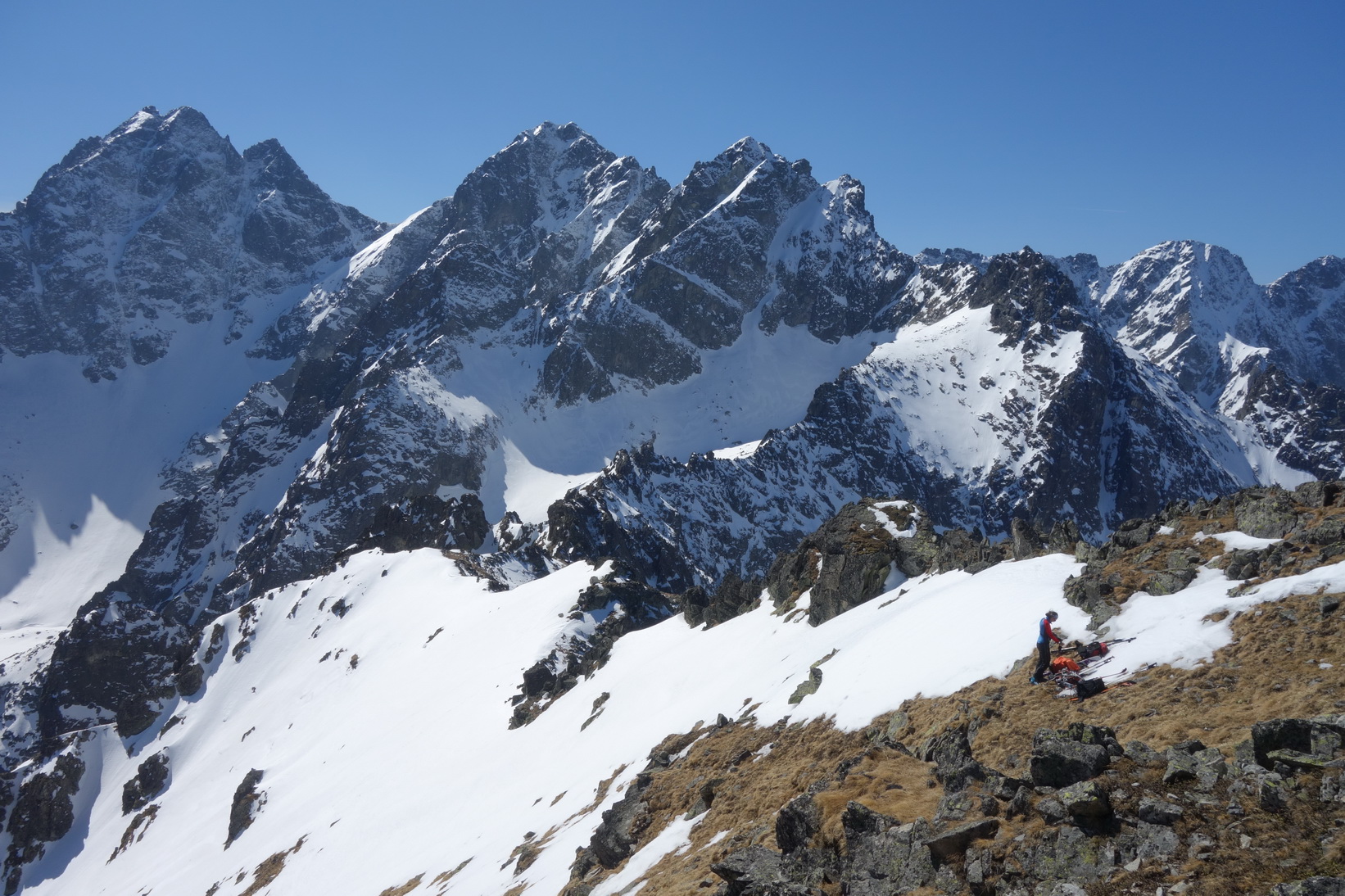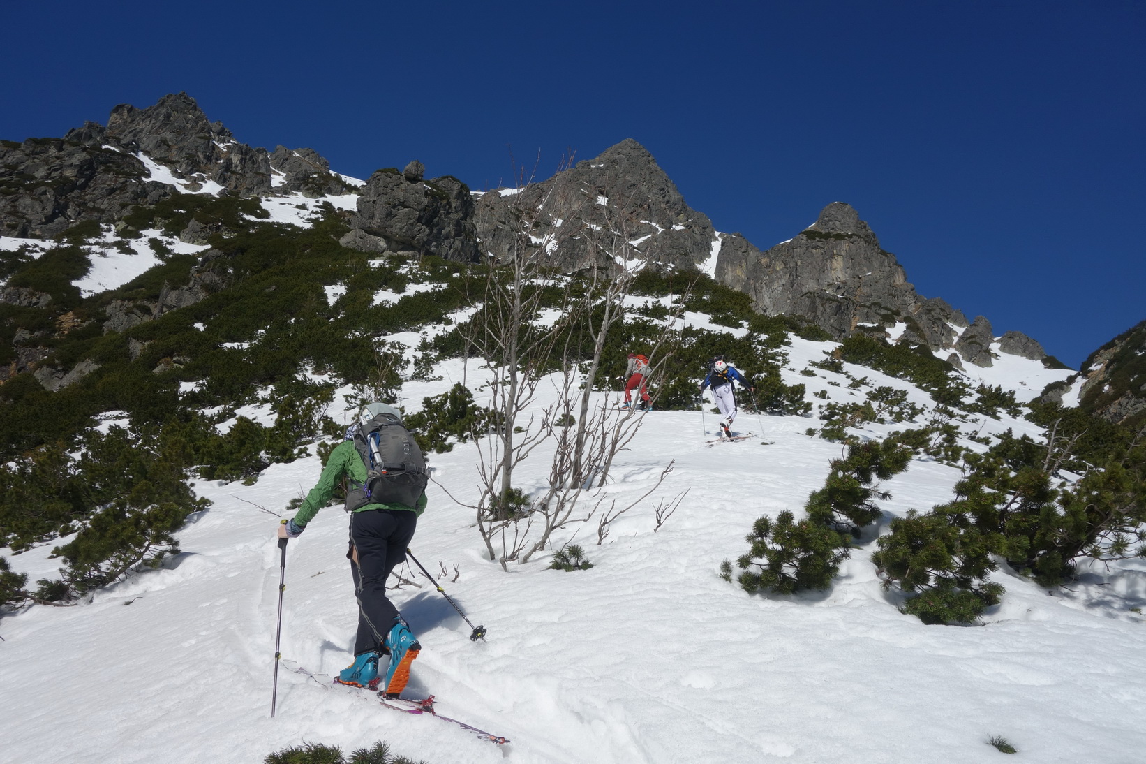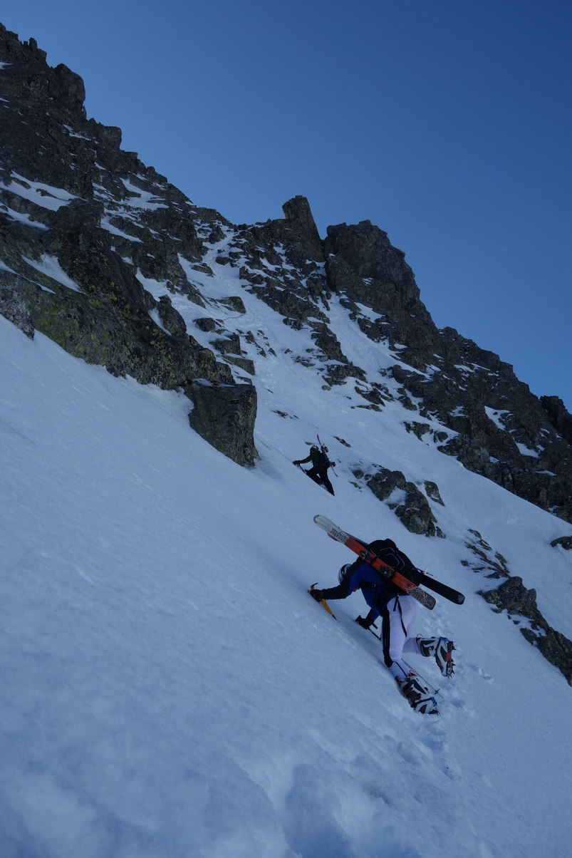 Výstup je náročný, v prehnitom snehu sa prebárame v kosodrevine, obchádzame vežičky a hľadáme rebrom cestu na vrchol. Trávami, rebierkami s kosodrevinou a prehnitým snehom dosahujeme vrchol, kde sa nám otvárajú neskutočné výhľady do Žabej Bielovodskej a Spádovej dolinky. Hodnú chvíľu sa kocháme a do zjazdu sa vôbec neponáhľame. Napriek poludniu sú úvodné oblúky ešte fajn a k Ťažkému plesu to nejako dobojujeme. Ťažká dolina je v tieni a až do rána sa na tom nič nezmení. Neponáhľame sa, no napriek tomu sme za 2 hodinky vo Váhe a oblúky ku chate sú ešte stále perfektné.