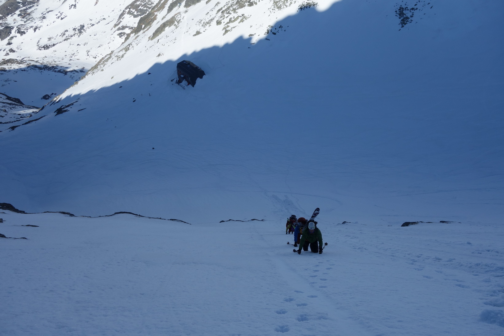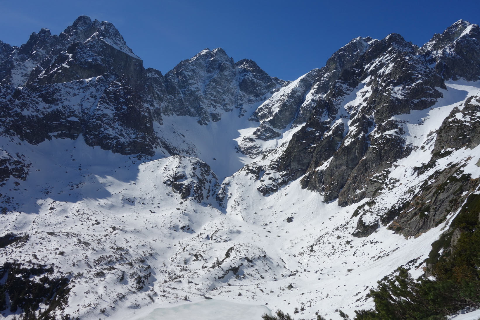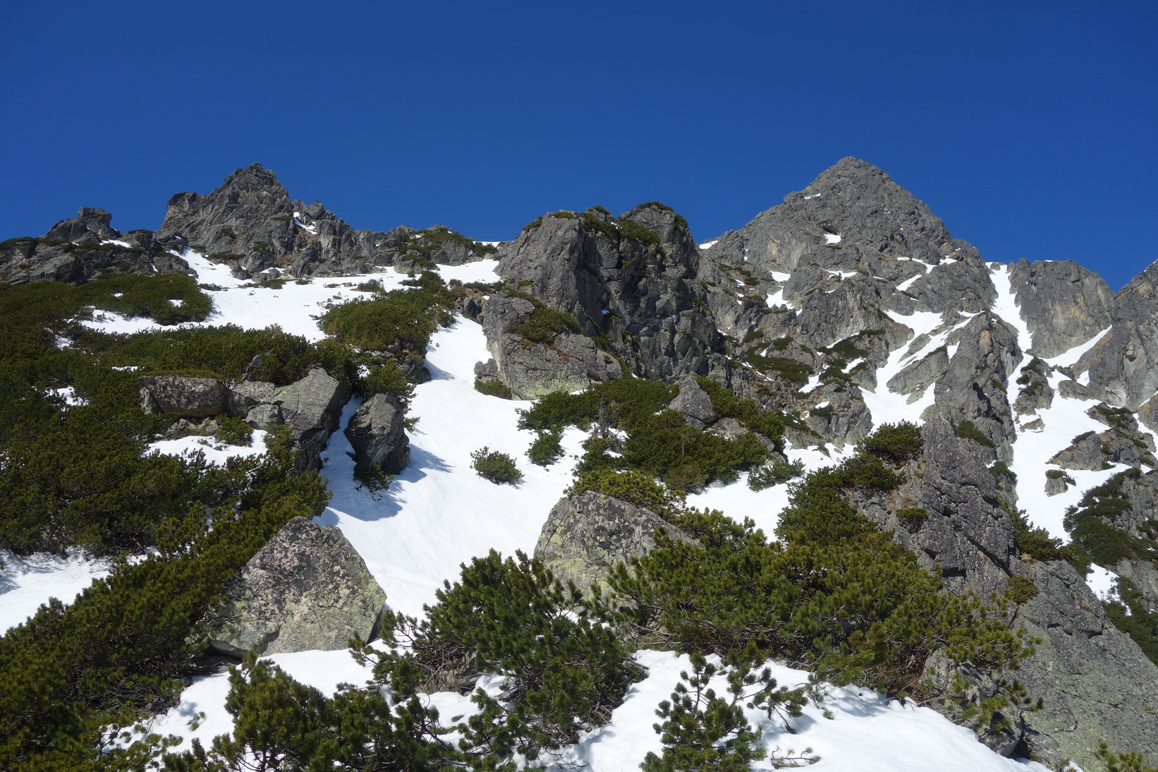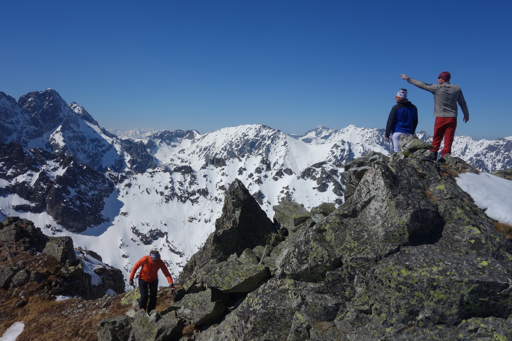 Výstup je náročný, v prehnitom snehu sa prebárame v kosodrevine, obchádzame vežičky a hľadáme rebrom cestu na vrchol. Trávami, rebierkami s kosodrevinou a prehnitým snehom dosahujeme vrchol, kde sa nám otvárajú neskutočné výhľady do Žabej Bielovodskej a Spádovej dolinky. Hodnú chvíľu sa kocháme a do zjazdu sa vôbec neponáhľame. Napriek poludniu sú úvodné oblúky ešte fajn a k Ťažkému plesu to nejako dobojujeme. Ťažká dolina je v tieni a až do rána sa na tom nič nezmení. Neponáhľame sa, no napriek tomu sme za 2 hodinky vo Váhe a oblúky ku chate sú ešte stále perfektné.