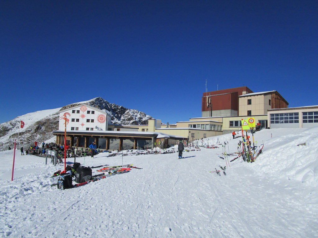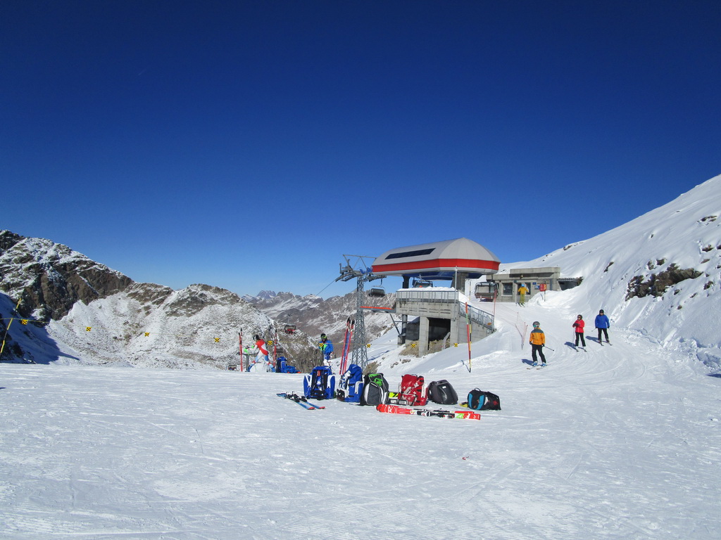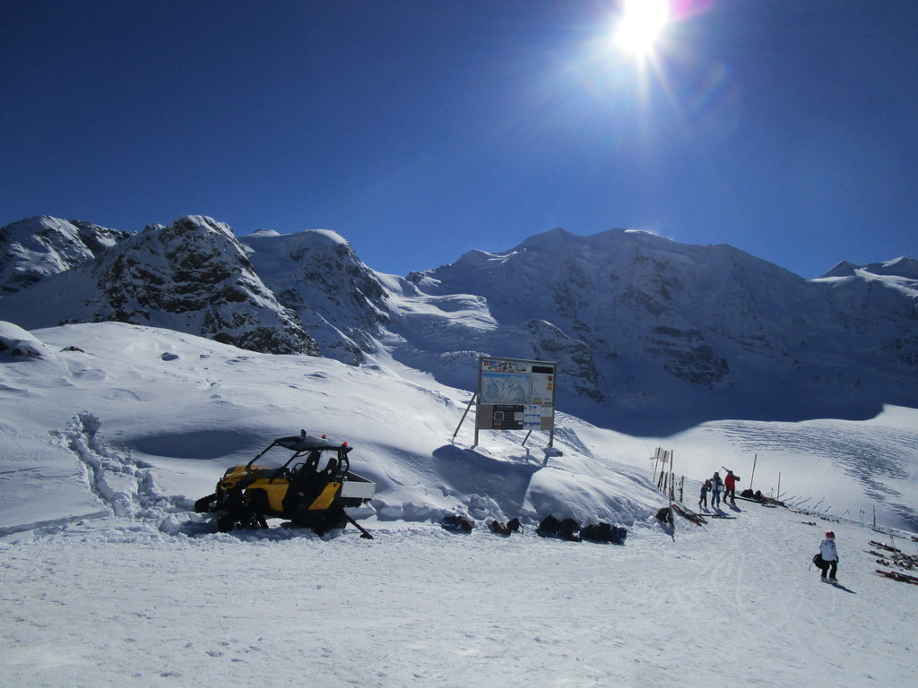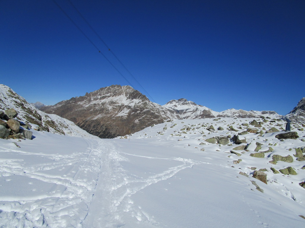 Idem aj ja. O chvíľu už šlapem svoje prvé metre. Čím vyššie som snehu pribúda. V hornej časti strediska ja pustená jedna krátka zjazdovka. Je tu len jedna sedačka. Pre pretekárov a rôzne kurzy stačí. V sobotu je tu plno. Vychutnávam si výhľady na Berninské Alpy. Ľadovec dostal v lete riadne na frak, v zime to na ňom bude zaujímavé... Klasická túra na Piz Palú, ktovie ako to s ňou dopadne. Pre vodcov to bude určite problém, je to ich najobľúbenejšia túra...