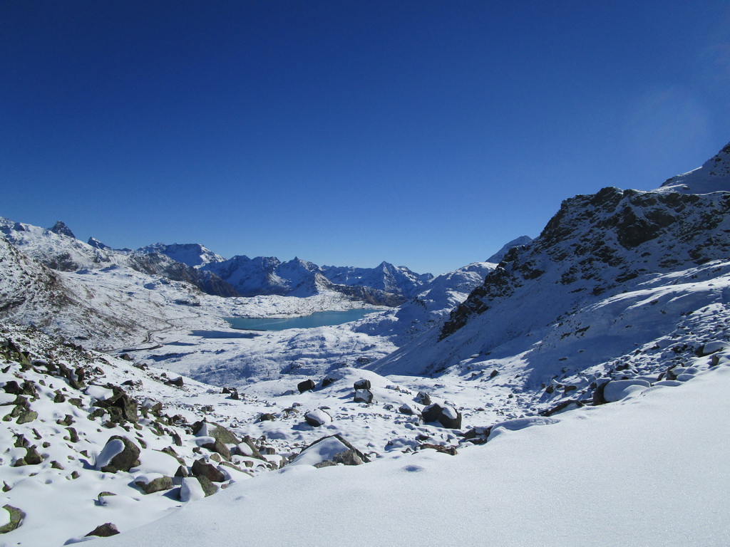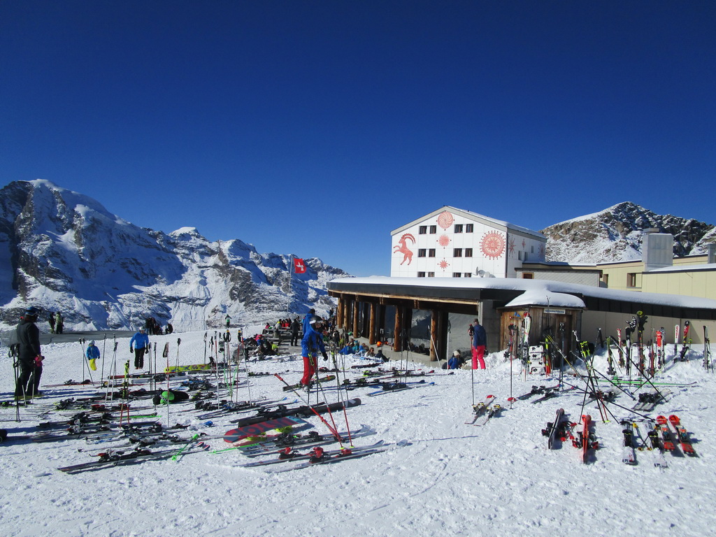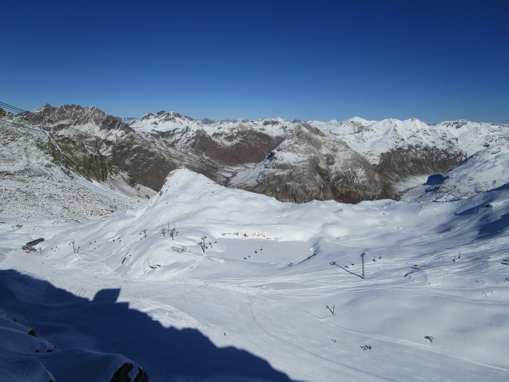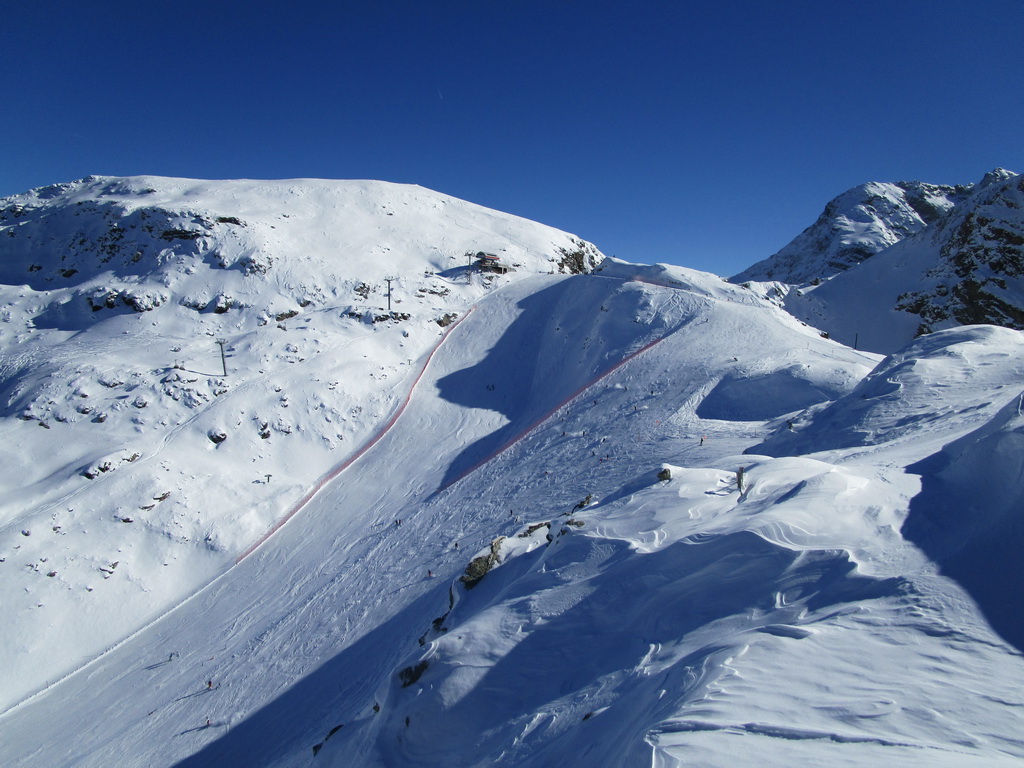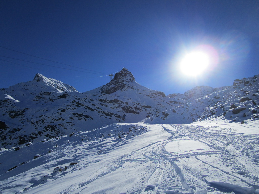 Idem aj ja. O chvíľu už šlapem svoje prvé metre. Čím vyššie som snehu pribúda. V hornej časti strediska ja pustená jedna krátka zjazdovka. Je tu len jedna sedačka. Pre pretekárov a rôzne kurzy stačí. V sobotu je tu plno. Vychutnávam si výhľady na Berninské Alpy. Ľadovec dostal v lete riadne na frak, v zime to na ňom bude zaujímavé... Klasická túra na Piz Palú, ktovie ako to s ňou dopadne. Pre vodcov to bude určite problém, je to ich najobľúbenejšia túra...