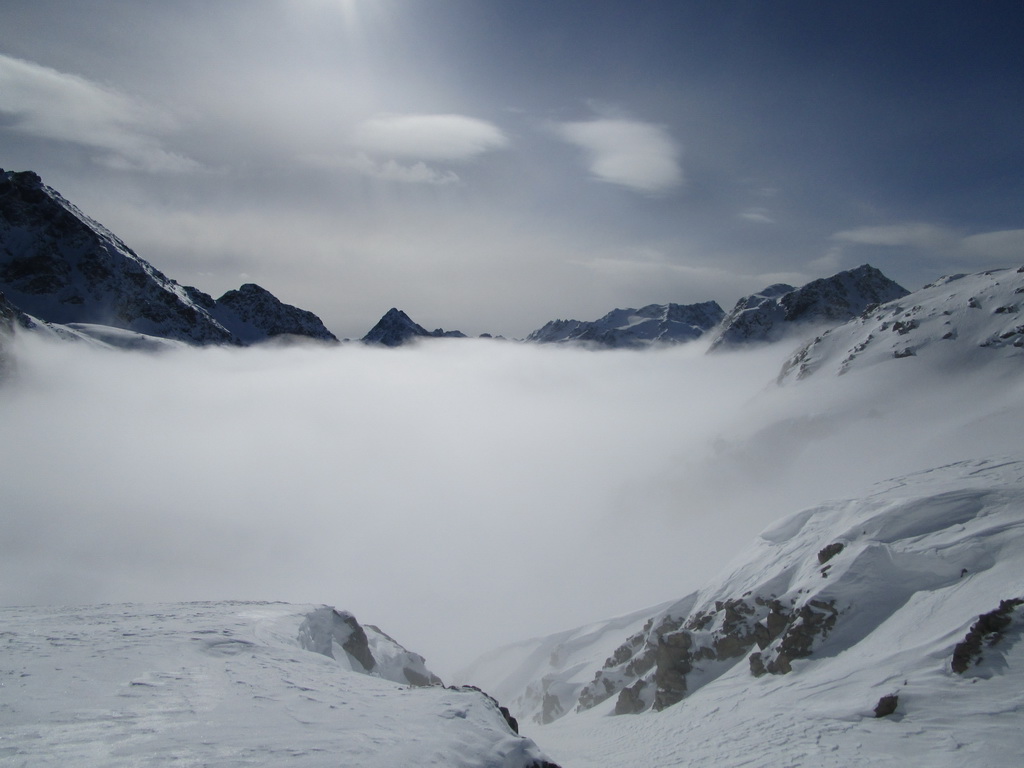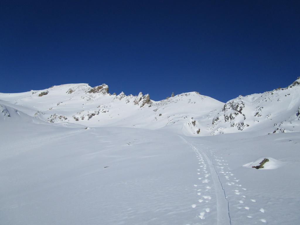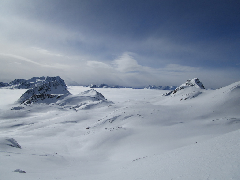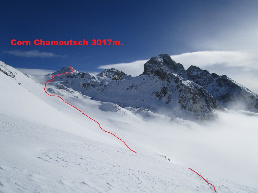 Prešlapávam stopu na Corn Chamoutsch. Heli depo je pod vrcholom, odkladám lyže a popoliezam na vrchol. Dole budem lyžovať dolinkou ktorou som vystúpal hore. Miesto kadiaľ sa púšťali heli lyžiari sa mi zdá moc vyfúkané. V závere zjazdu spomaľujem a slalomom pomedzi kamene sa dostávam dolinkou naspäť ku autu.