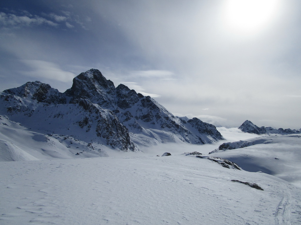Skupinku predo mnou už dobieham až na malom kopčeku nad sedlom Fuorcla Marguns. Ďakujem im za parádnu stopu. Ani som nerozmýšlal, že by som prvý výšlap viedol niekde inde ako po luxusnej stope. Ten druhý si už ale dávam do panenského terénu. Už počas výstupu som videl ako z vrtuľníku na neďalekom kopčeku vysadzujú lyžiarov. Taký trošku trápny pokus o heliskiing. Parametre toho zjazdu, ktorý na nich čaká totiž nie sú nič moc...