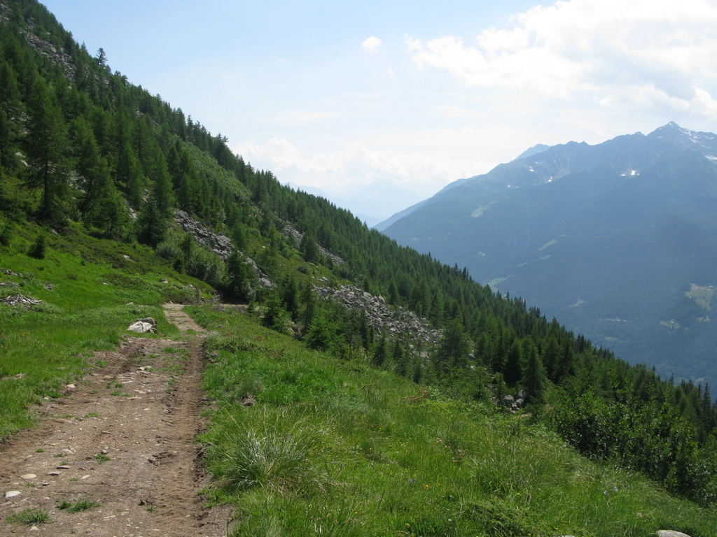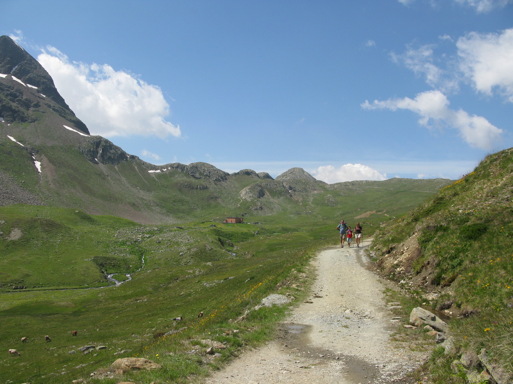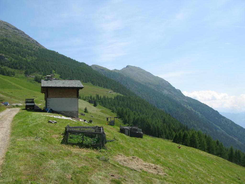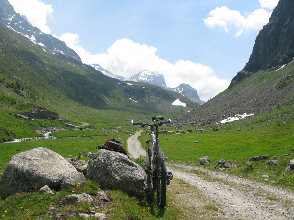 Značka nakreslená na mape kúsok za chatou zmizne, sú tu len chodníčky prešlapané kravami. Všade je blato a bažina. Podarí sa mi dostať sa cez to pomerne suchými nohami. Cesta ktorú vidím v ďiaľke mi hovorí, že nemôžem zablúdiť. Takto sa po chvíli predierania cez kosovku, prenášanie bajku a obchádzania jazierok na lúke dostávam opäť na cestu. Pri usadlosti sa pýtam taliana na cestu, zisťujem že aj tak musím zjazdovať dole.