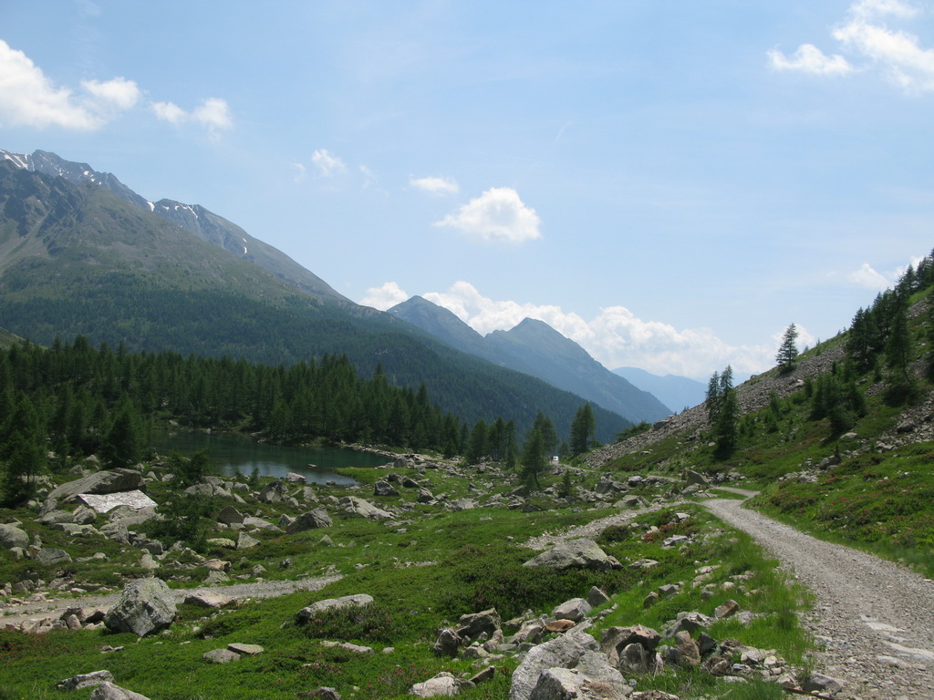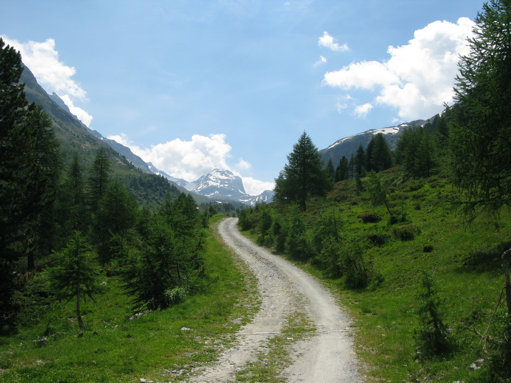 Prechádzam autom cez Passo Bernina v smere z Pontresiny do Poschiava, míňam odbočku na Livigno a zastavujem na parkovisku pod Val di Campo (1600m). Pri ceste tu je reštaurácia, hotel, zastávka autobusu, miesto sa volá Sfazú. Do údolia Val di Campo šliapem už na bajku po kvalitnej štrkovej ceste, tá sa neskôr pri chate Saoseo mení na zjazdný singltrail. Prechádzam okolo jazera Viola, a smerujem do rovnomerného sedla. Tu treba už občas aj trošku potlačiť. Za posledných pár rokov tu vyrástol zjazdný chodníček, používaný prevažne v opačnom smere.
