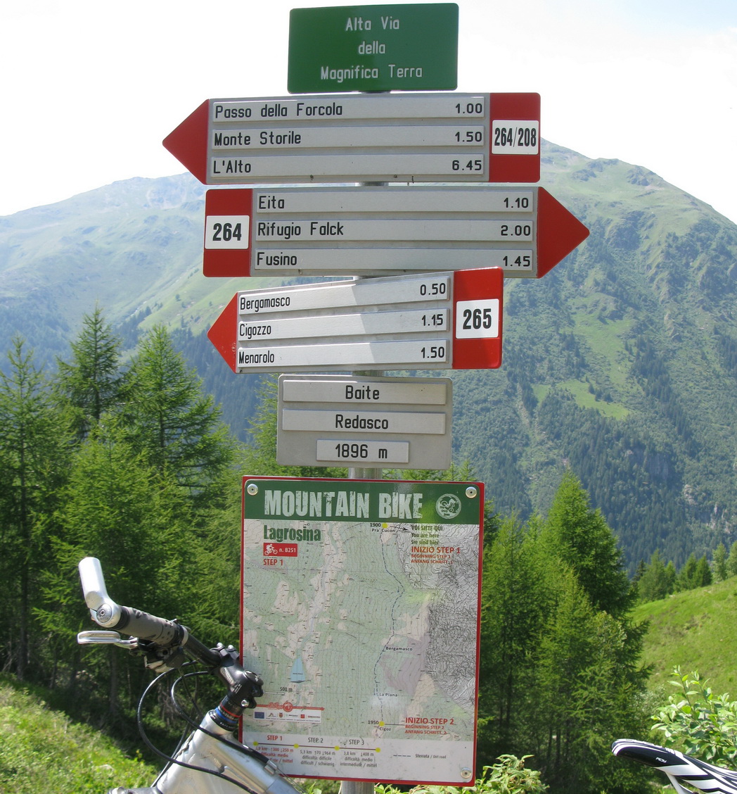Vychádzam na lúky s usadlosťami, miesto zvané Baite Redasco 1896m. Mám pochybnosti o tom, či tu vôbec bude niečo ďalej zjazdné, keď zazriem v dialke už známu tabuľu, rovnaký typ ako na Mortirole a na Col dAnzane. Za ňou vidieť chodníček zarezaný do svahu. Vyzerá byť pomerne čerstvo spravený...