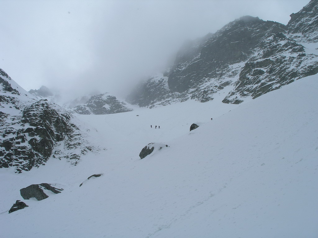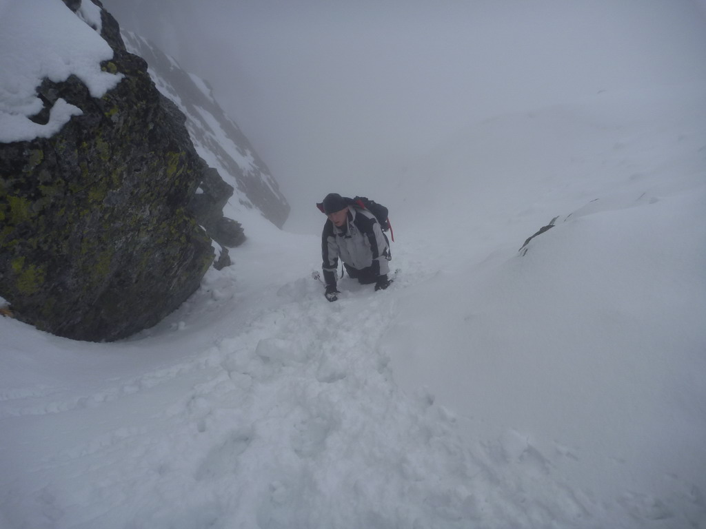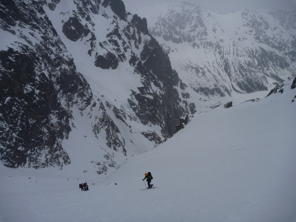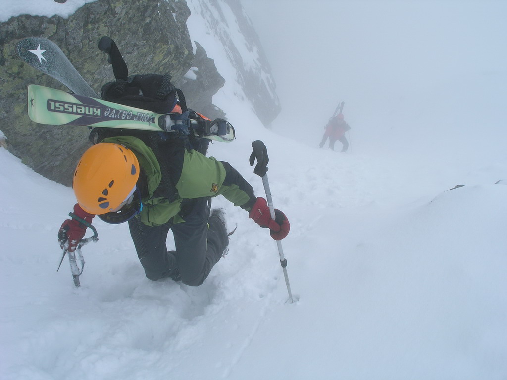 Dnes je však starý sneh dostatočne stabilný a nového je málo. Pokračujeme a za nami aj poľské družstvo. Robím stopu, vzrušenie sa stupňuje. Zdá sa mi, že idem rýchlo, ale výstup samotným žlabom trvá nekonečnú hodinu. Konečne! V štrbine spoločné foto, výhľad nulový, vrcholový úsek s reťazami si nechávame nabudúce. Hneď, ako dorazí prvý peší turista, začínam zostup na lyžiach. Prvé metre sa necítim príjemne, v spádnici je koryto a lyže mám ohnuté. Naviac pod čerstvým snehom sa objavujú skaly. Zošlapávam teda ešte zopár metrov. Na sklznicu sa mi lepí veľké množstvo čerstvého snehu. To zisťuje aj Wiktor, keď ma nedobrovoľne predbieha pomaly sa kĺzajúc so snehovými „papučami“ na hranách. Našťastie v mäkkom podklade ihneď zabrzdí paličkou. Očistím si sklznice, okolo mňa zatiaľ vystupuje druhý peší turista. Poprosím Wiktora, aby mi urobil zopár fotiek a začínam lyžovať. Po prvom preskoku sa cítim komfortne. Lyže výborne držia a opatrnými preskokmi míňam Wiktora a aj posledného vystupujúceho z trojčlenného poľského družstva.