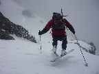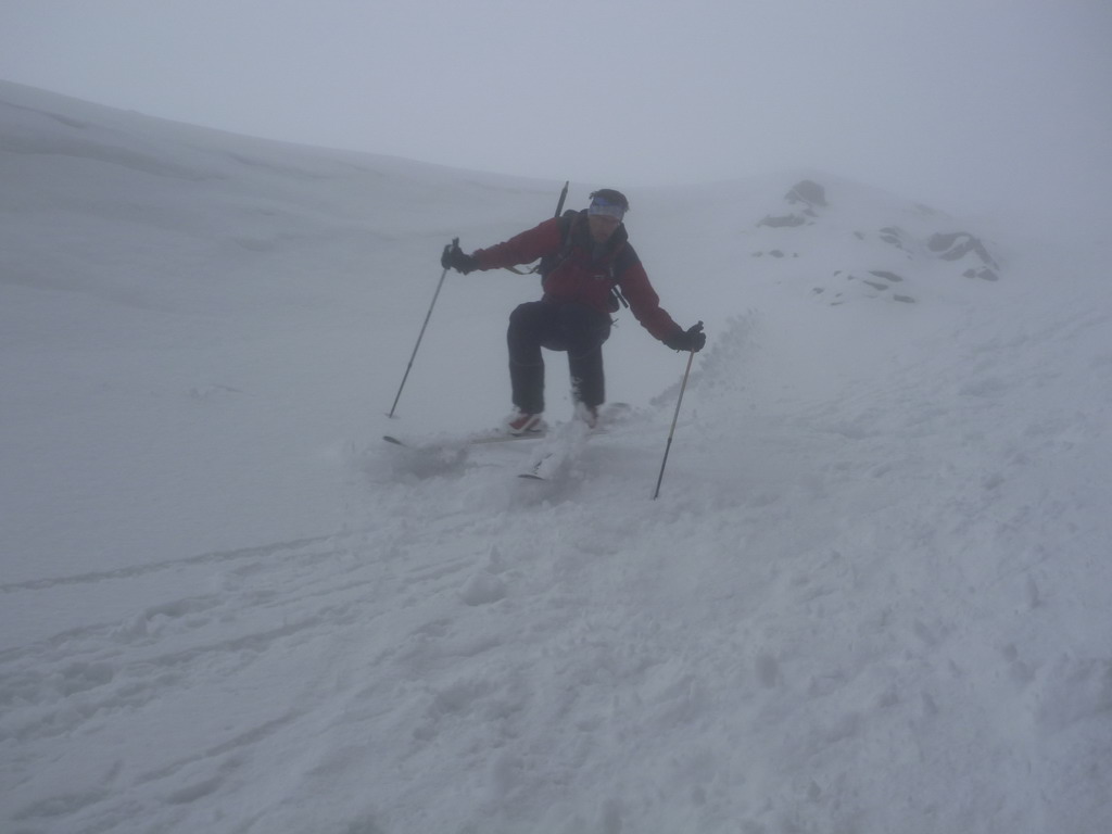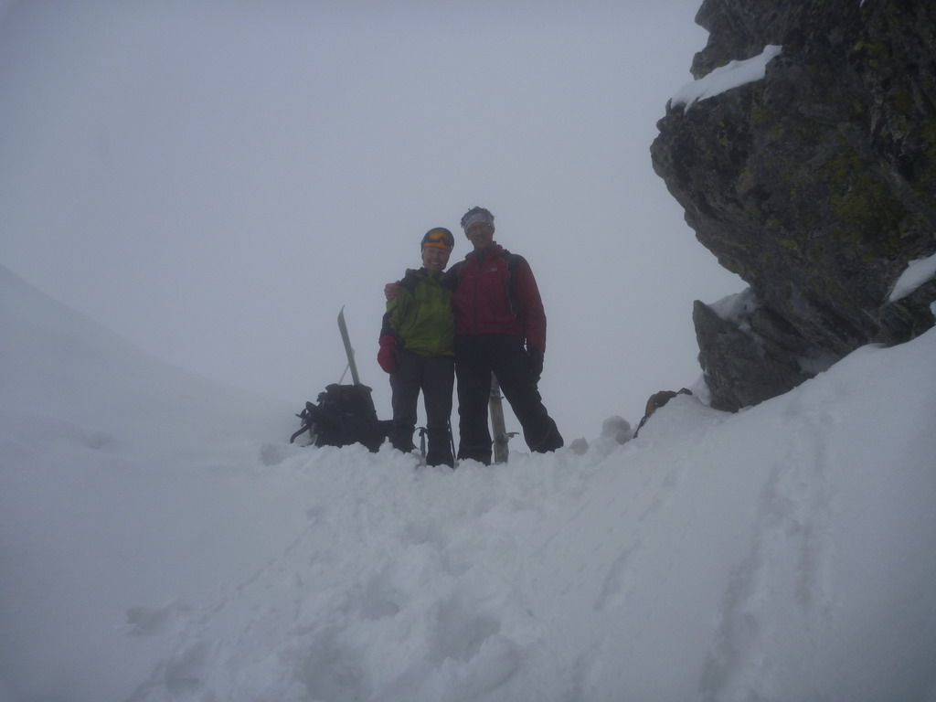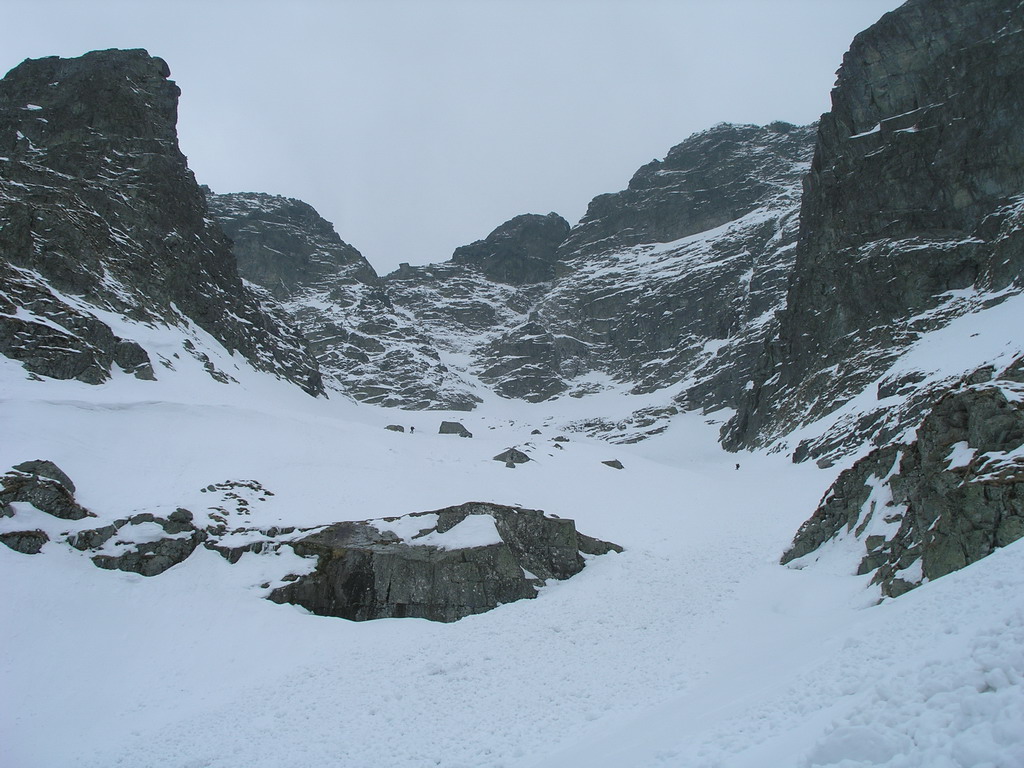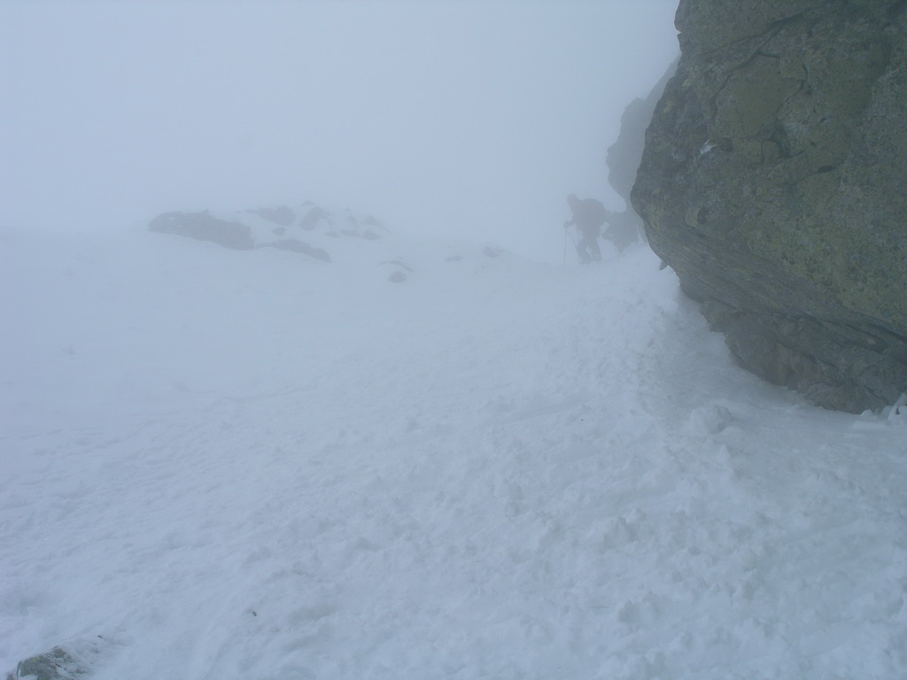 Dnes je však starý sneh dostatočne stabilný a nového je málo. Pokračujeme a za nami aj poľské družstvo. Robím stopu, vzrušenie sa stupňuje. Zdá sa mi, že idem rýchlo, ale výstup samotným žlabom trvá nekonečnú hodinu. Konečne! V štrbine spoločné foto, výhľad nulový, vrcholový úsek s reťazami si nechávame nabudúce. Hneď, ako dorazí prvý peší turista, začínam zostup na lyžiach. Prvé metre sa necítim príjemne, v spádnici je koryto a lyže mám ohnuté. Naviac pod čerstvým snehom sa objavujú skaly. Zošlapávam teda ešte zopár metrov. Na sklznicu sa mi lepí veľké množstvo čerstvého snehu. To zisťuje aj Wiktor, keď ma nedobrovoľne predbieha pomaly sa kĺzajúc so snehovými „papučami“ na hranách. Našťastie v mäkkom podklade ihneď zabrzdí paličkou. Očistím si sklznice, okolo mňa zatiaľ vystupuje druhý peší turista. Poprosím Wiktora, aby mi urobil zopár fotiek a začínam lyžovať. Po prvom preskoku sa cítim komfortne. Lyže výborne držia a opatrnými preskokmi míňam Wiktora a aj posledného vystupujúceho z trojčlenného poľského družstva.