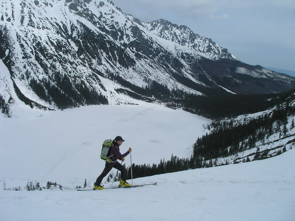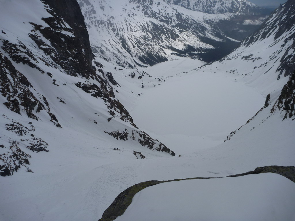 Nasleduje najkrajšia časť túry - dlhá lyžovačka žlabom, ktorý si drží svoj sklon počas celej dĺžky. Pocity umocňuje tenká vrstva nového snehu odchádzajúca spod lyží. K Czarnemu stawu už lyžujeme v mokrom snehu spoločne so Silviou. Po chvíľke oddychu zbadáme dve vzdialené postavičky bezpečne lyžovať dole svahmi okolo Buly a tešíme sa z nádherného dňa, v ktorom začína opäť dominovať spoločenská stránka. Jedna túžba sa splnila.