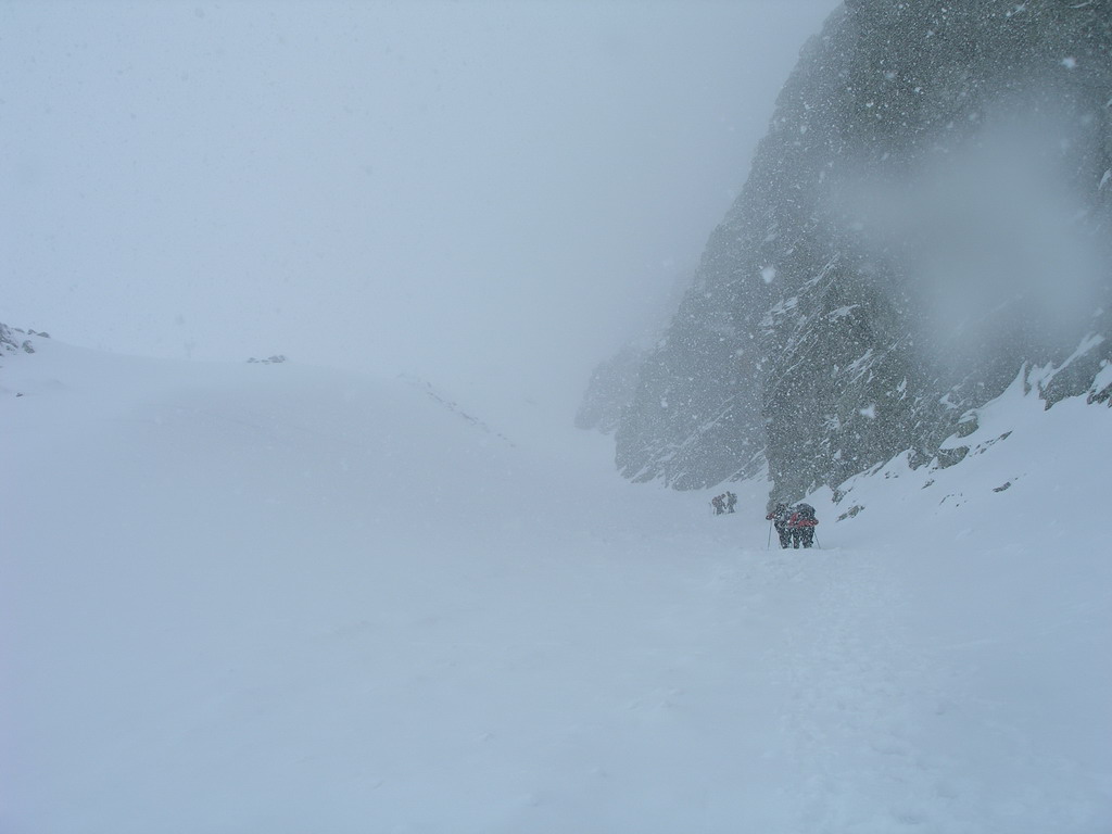 Wiktor s Ester nahodili pokojné tempo, čo mi vyhovuje, v nohách mám množstvo výstupov z posledných troch dní. Napriek tomu dobiehame trojicu peších turistov, s ktorými máme rovnaký smer. Pred vstupom do žlabu Rysov sa husto rozsneží. Silvia sa tu rozhodne pre návrat. Športový aspekt výletu začína prevažovať nad spoločenským a ja rýchlo dobieham ostatných, ktorí akoby váhali na začiatku rokliny. Priatelia majú obavy z lavín a zvažujú návrat.