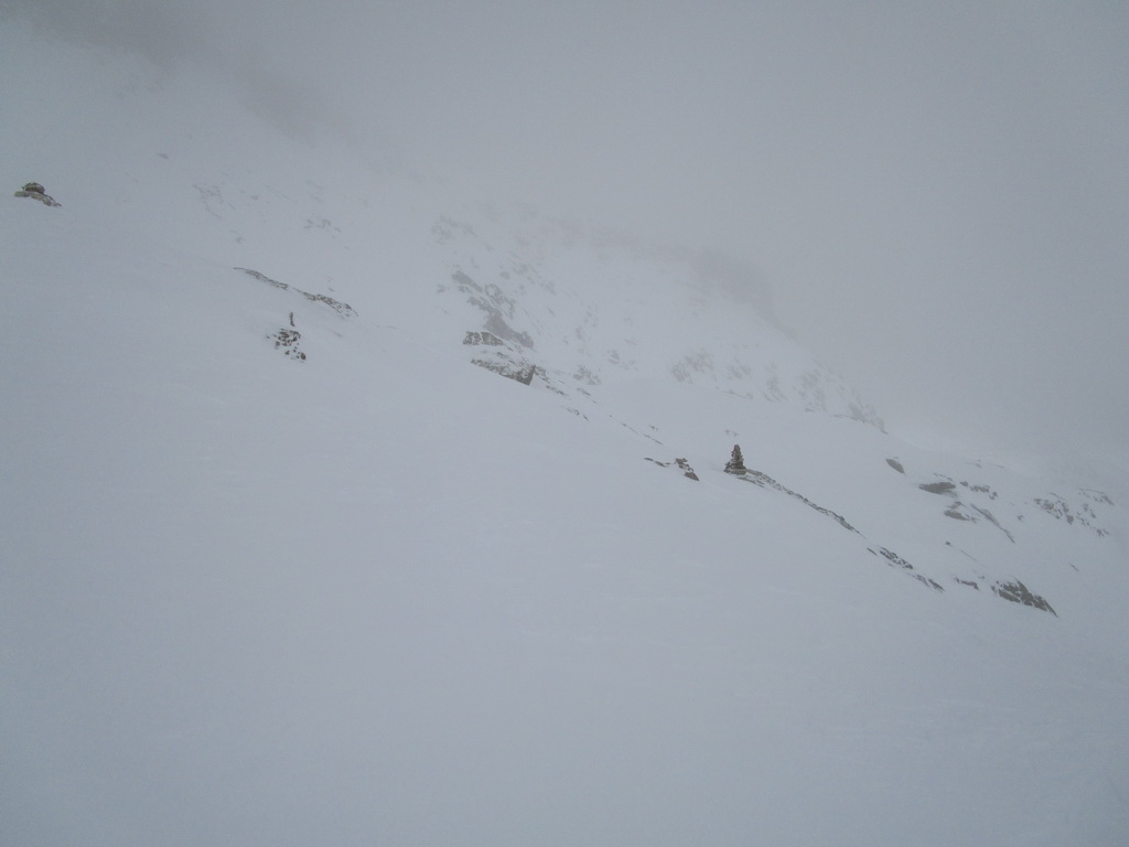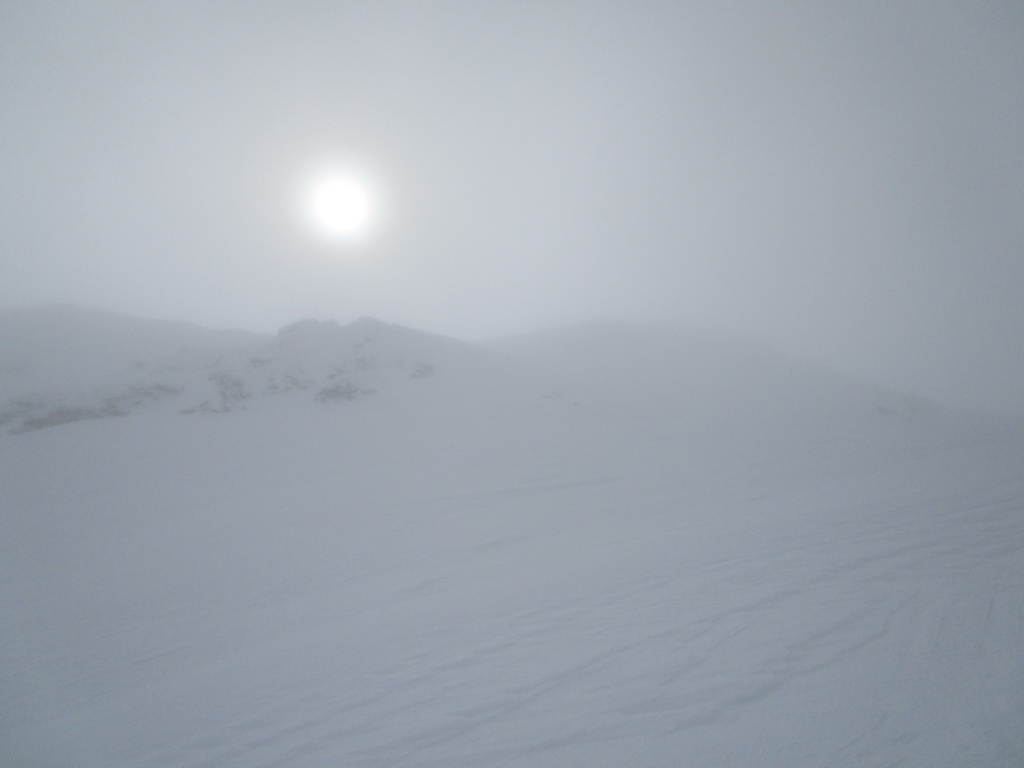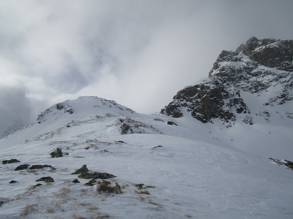 Odtiaľto stúpame po hrebienku, kde sme v bezpeží pred lavínami a pomedzi vysoké skalné mužíky sa mierne traverzujúc vľavo dostaneme ku záverečnému výšvihu. Na lyžiach sa dá vystúpiť až na vrchol pýšiaci sa úžasnými výhľadmi. Návrat tou istou trasou.