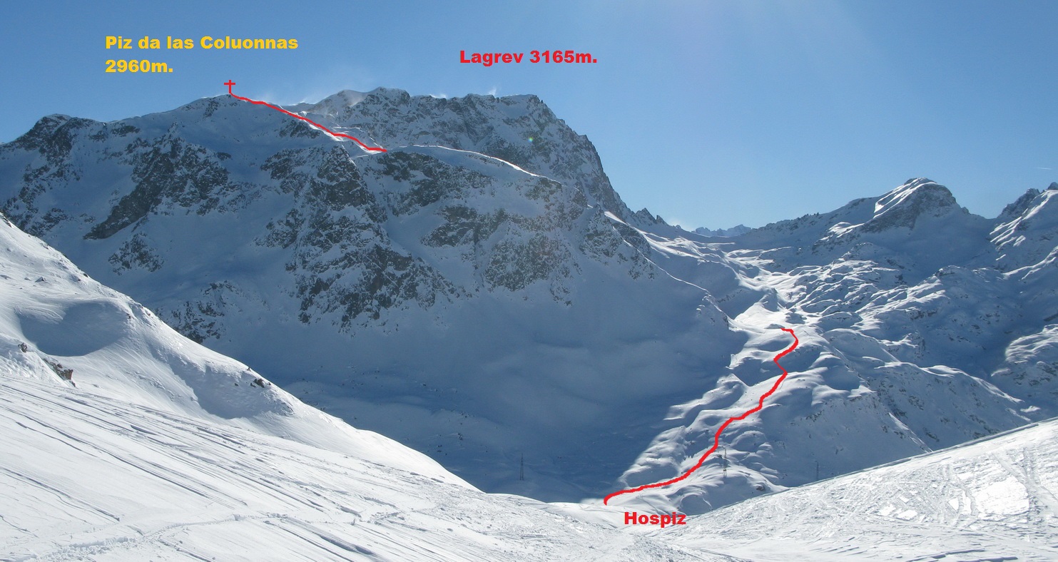Jednou z obľúbených ale aj najkrajších túr z Julierpassu je skialpová túra na Piz da las Coluonnas. Na túru vyrážame priamo od Hospizu La Veduta. Parkuje sa pred hostincom. Prejdeme na druhú stranu cesty a následuje mierny výšľap na pahorok na úpätí samotného kopca Coluonnas. Odtiaľto vidíme jazero Grevasalvas ale nepôjdeme k nemu dole. Následuje traverz úbočím vľavo a následne naberanie výšky až na hrebeň nášho cieľu: Piz da las Coluonnas.