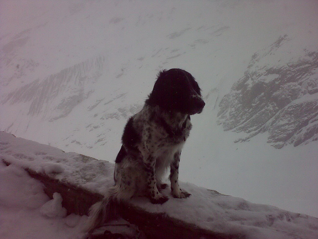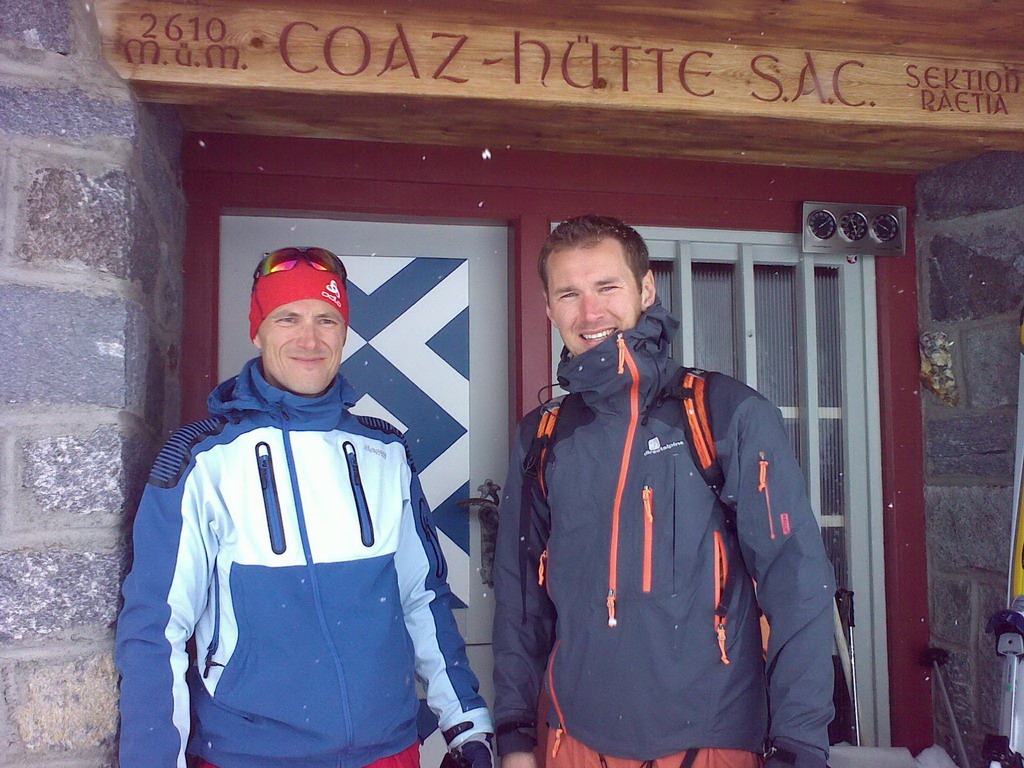 Zastavili sme sa aj na chate Chamanna Coaz, ktorá je považovaná za jednu z najlepších skialpových chát v Alpách. Mali sme šťastie, vrtuľník akurát doviezol chatára so štvornohým pomocníkom a kým sme vyšliapali na chatu, už sa v peci kúrilo...