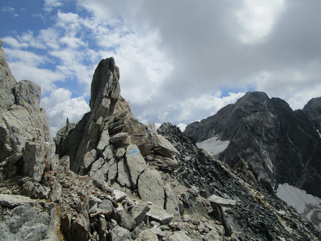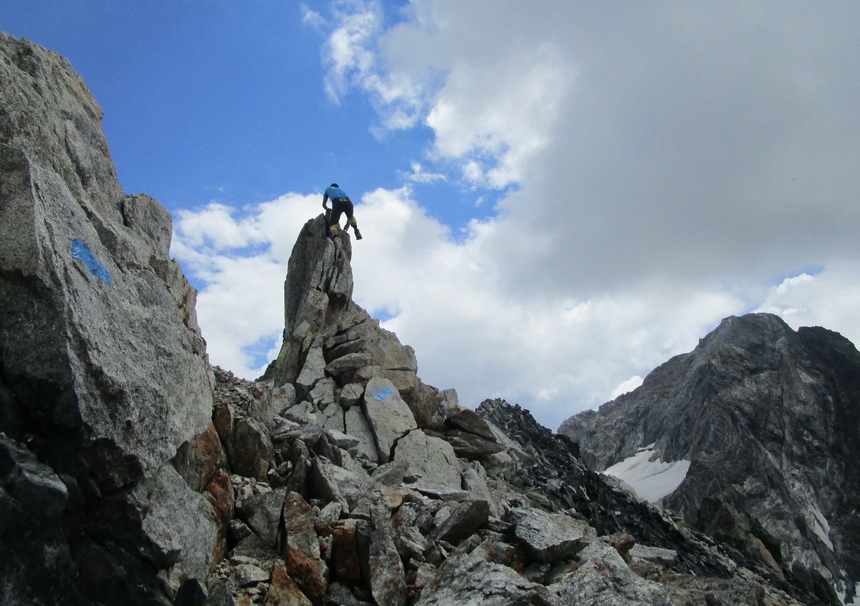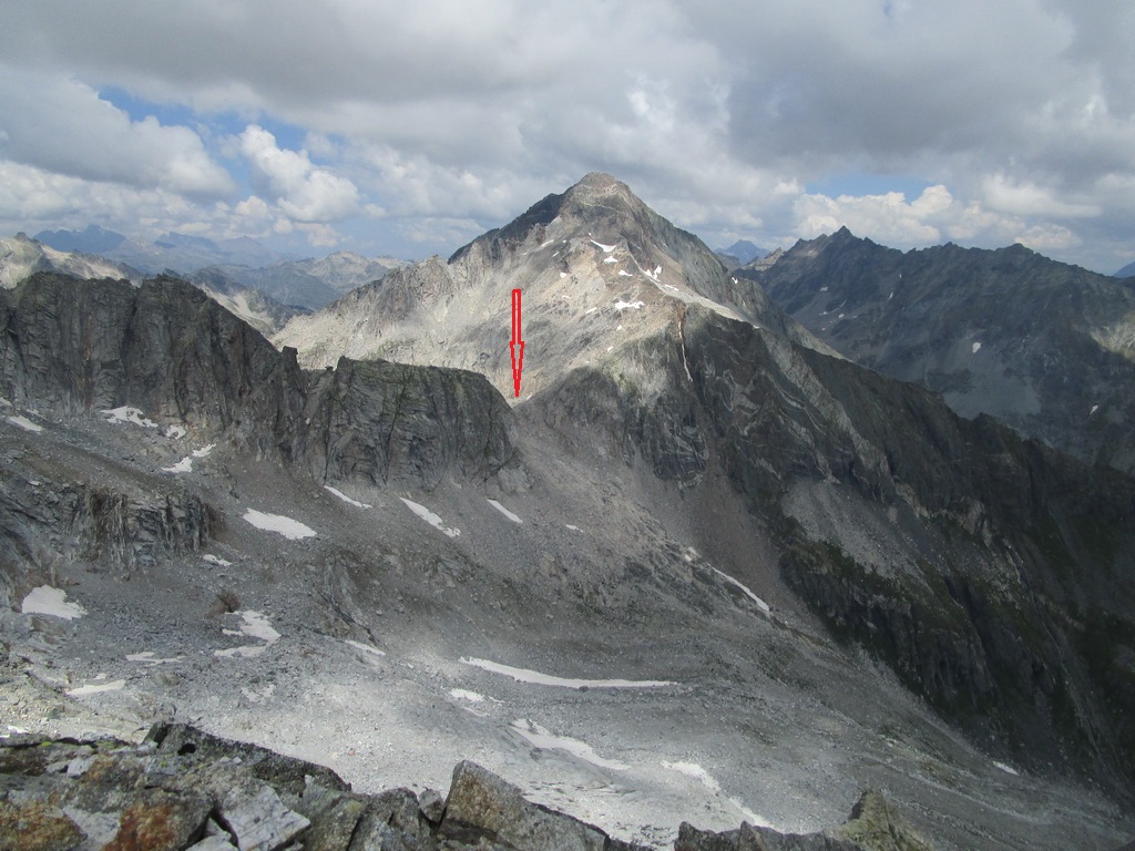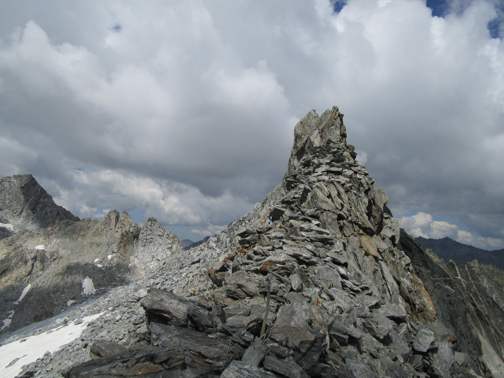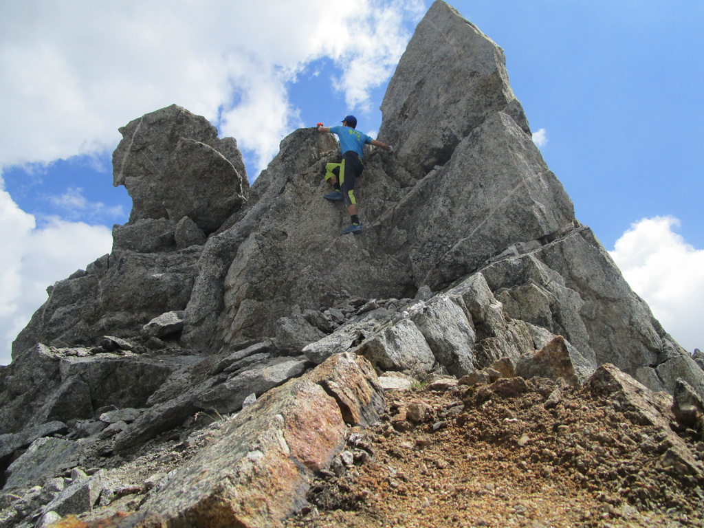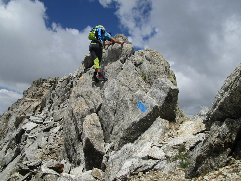 Vyrážam s pozdravom, že vidíme sa za pár hodín... Začiatok vedie po už známej trase na Monte Rosso, ktorú Beat dokončil minulý rok a report z nej si nájdete dole pod článkom. V miestach kde značka odbáča smerom hore na vrchol odbočuje doprava nová modrá značka. Tá ma zavedie až na Passo Vazzeda ale tesne pod ním tu je vyznačená odbočka doľava na vrchol Cima di Val Bona. Pod vrcholom pekný hrebienok, najkrajšie úseky zaistené reťazami.