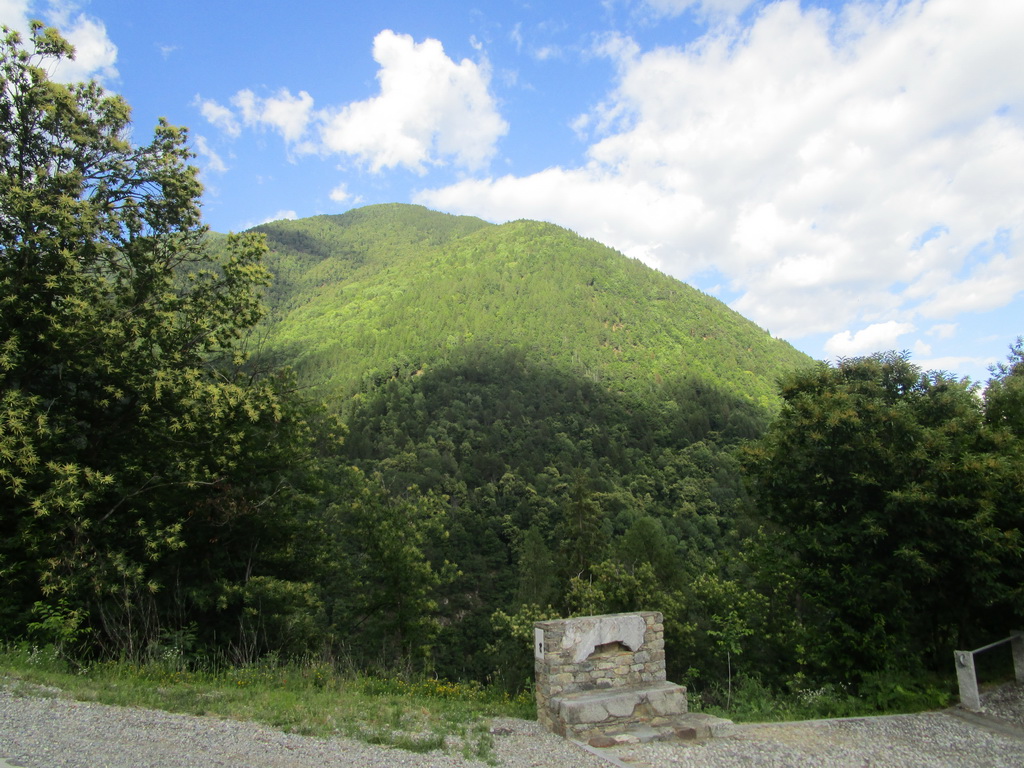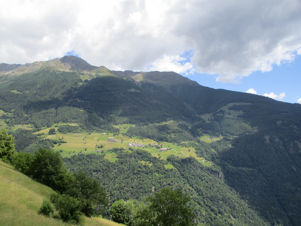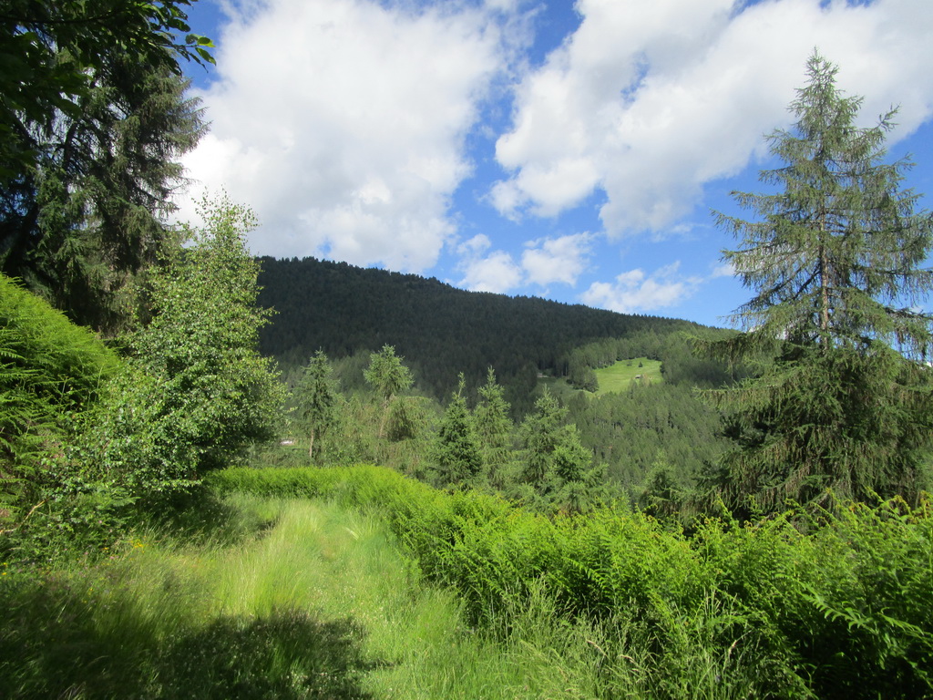 Pokračujem dlhým a krásnym chodníčkom. Krátke stúpania striedajú dlhšie zjazdové úseky až do Val Fontana. Odtiaľ už pokračujem v zjazde po asfaltke. Škoda, že musím zjazdovať veľa výškových metrov asfaltom ale nepokúšam sa hľadať nejaký chodníček v lese, dolina je úzka a oficiálne bajkové značenie ma udržiava na asfalte. Schádzam do údolia Valtelliny. Cyklistický raj na zemi... A kua koľko zelene... Lesy aj dole v údolí sa striedajú s kukuričnými poliami a jablkovými sadmi.
